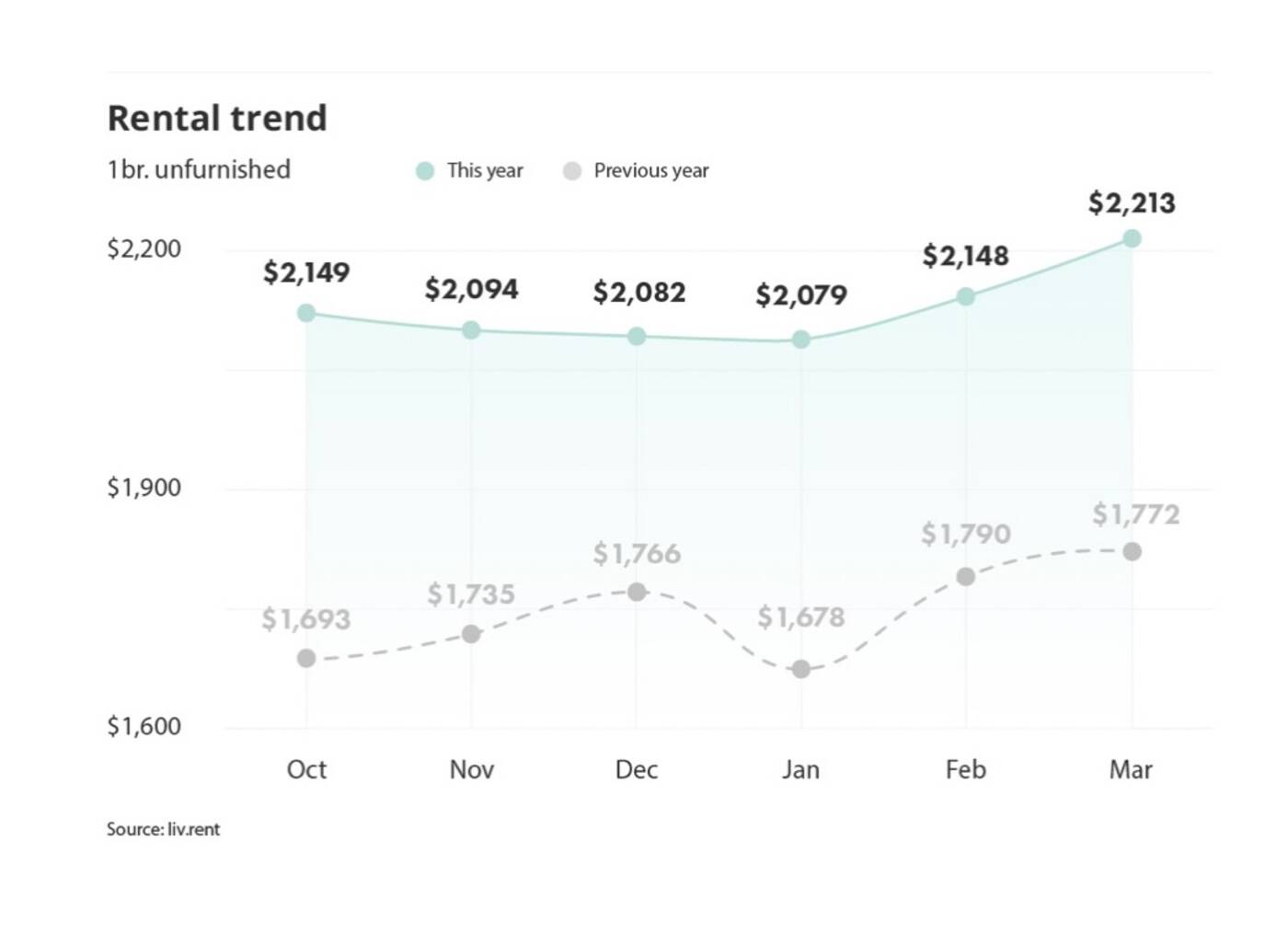 The average price for a downtown unfurnished one-bedroom apartment was $2,003 However, the March. 2023 report reveals that the same units are now going for $2,408, representing an increase of $400.