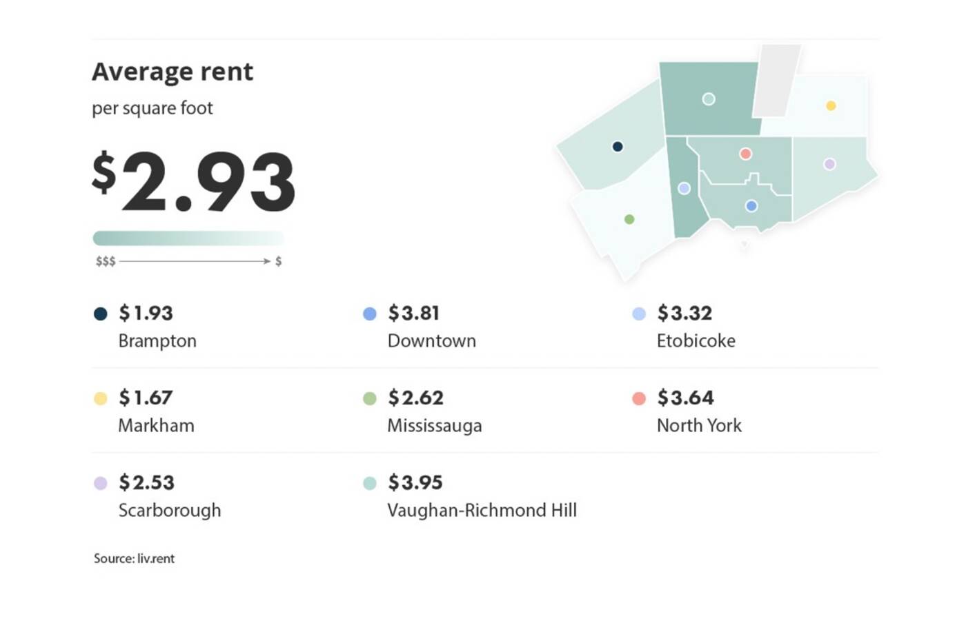 According to this month's report, Vaughan-Richmond Hill had the most expensive rent per square foot, while Markham had the least expensive costs for space on average.
