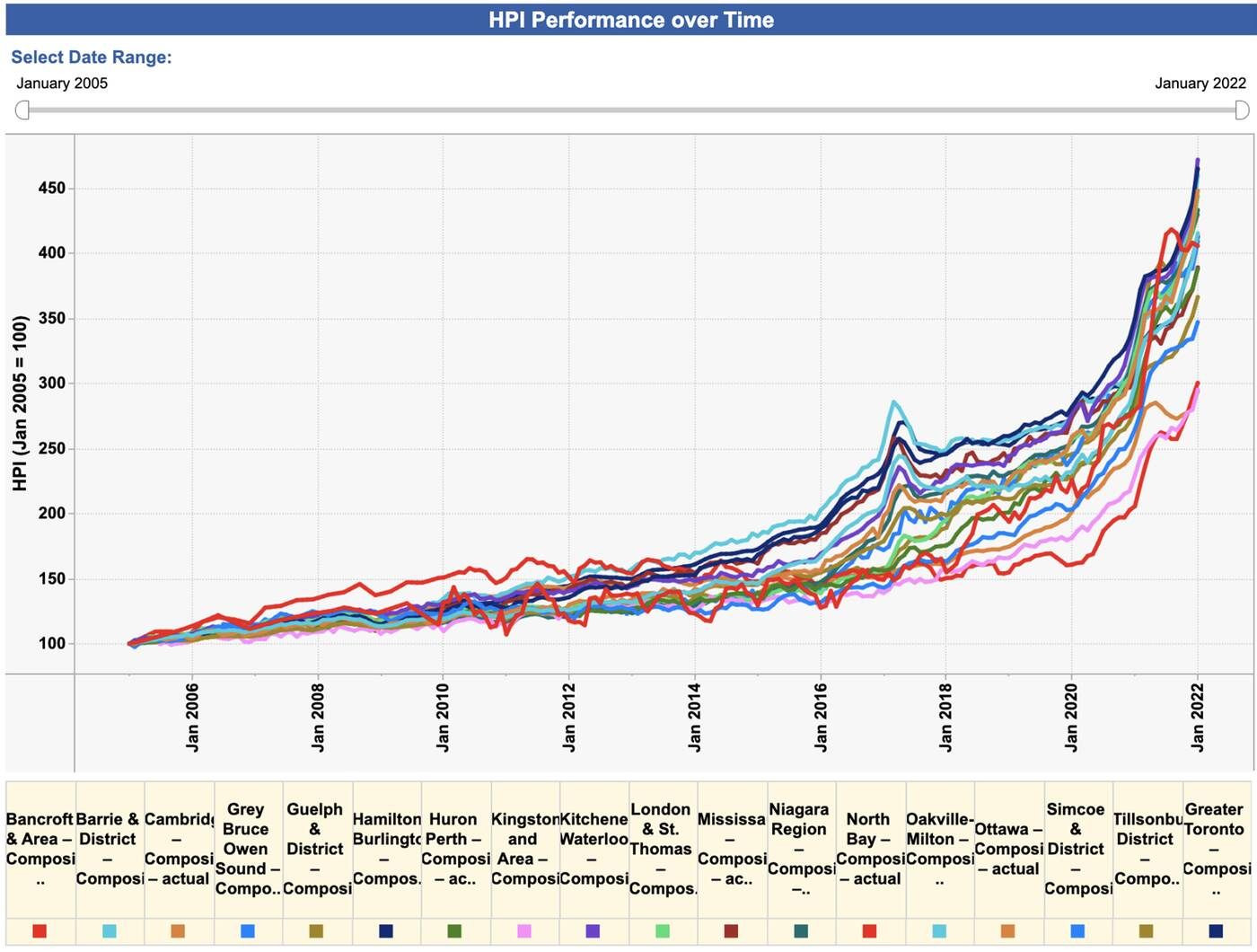 Prices are climbing to never-before-seen levels in Brampton, Guelph, Hamilton, Burlington, Niagara, Oshawa, Peterborough, Sault Ste. Marie, Windsor, Kingston and others. This revealing chart puts, into perspective, how big the increases have been, especially over the course of the pandemic.